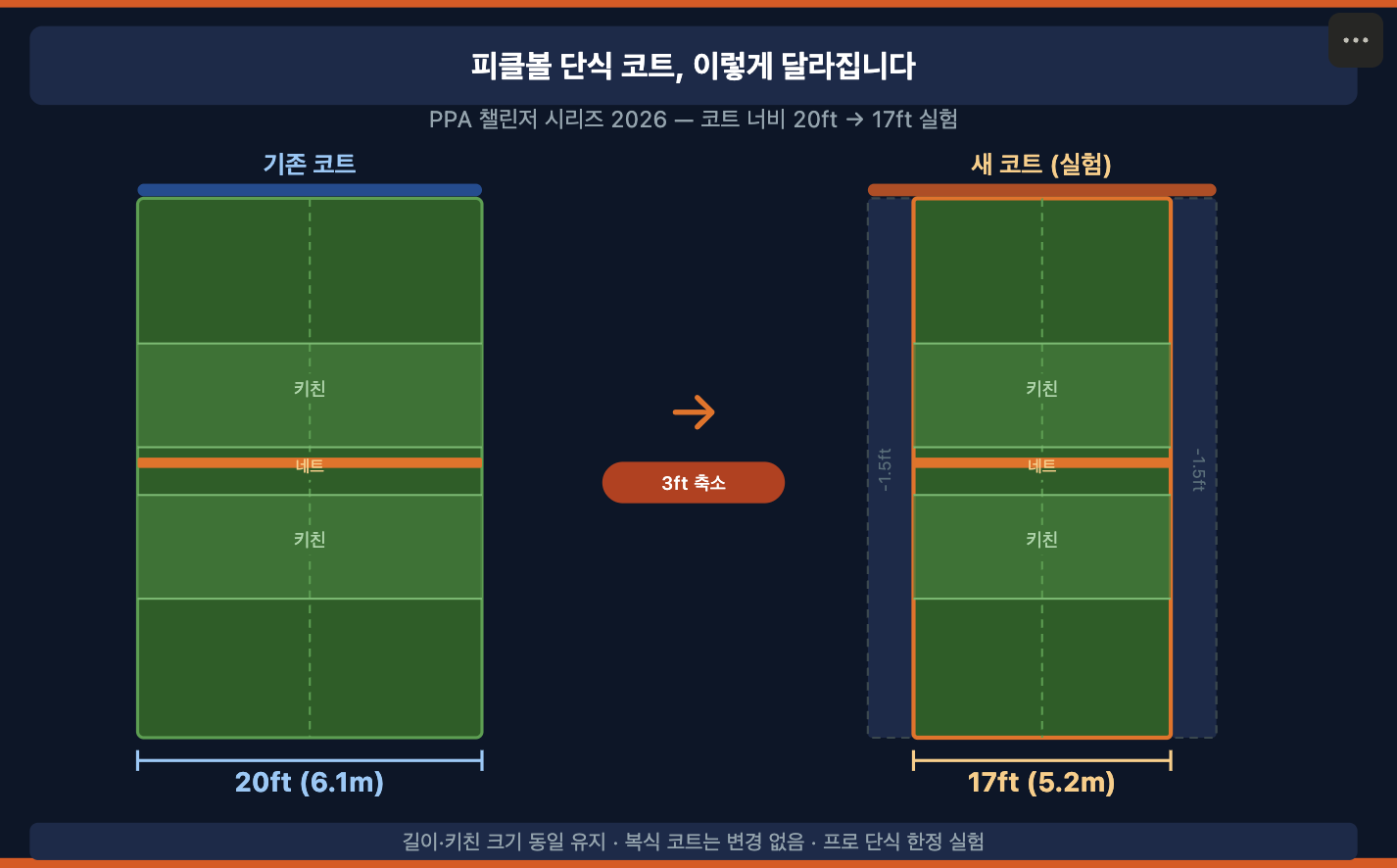 피클볼 역사에서 꽤 파격적인 실험이 시작됐어요. 2026년 1월, PPA 챌린저 시리즈가 단식 프로 경기에서 코트 너비를 줄이는 테스트를 공식 발표했습니다. 기존 20피트(약 6.1m)에서 17피트(약 5.2m)로, 양쪽 사이드라인을 각각 1.5피트씩 안으로 당기는 변화예요.