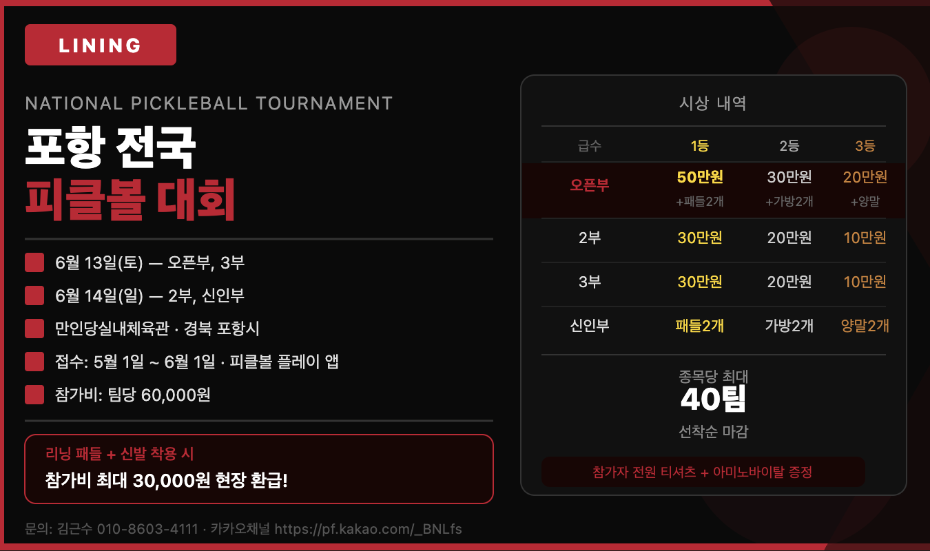 리닝코리아가 후원하는 전국 규모 피클볼 대회가 경북 포항에서 열려요. 오픈부부터 신인부까지 총 12개 종목, 종목당 최대 40팀씩 운영되는 대형 대회예요. 특히 리닝 패들과 신발을 착용하면 참가비 일부를 현장에서 돌려받을 수 있는 특별 혜택도 있어요!