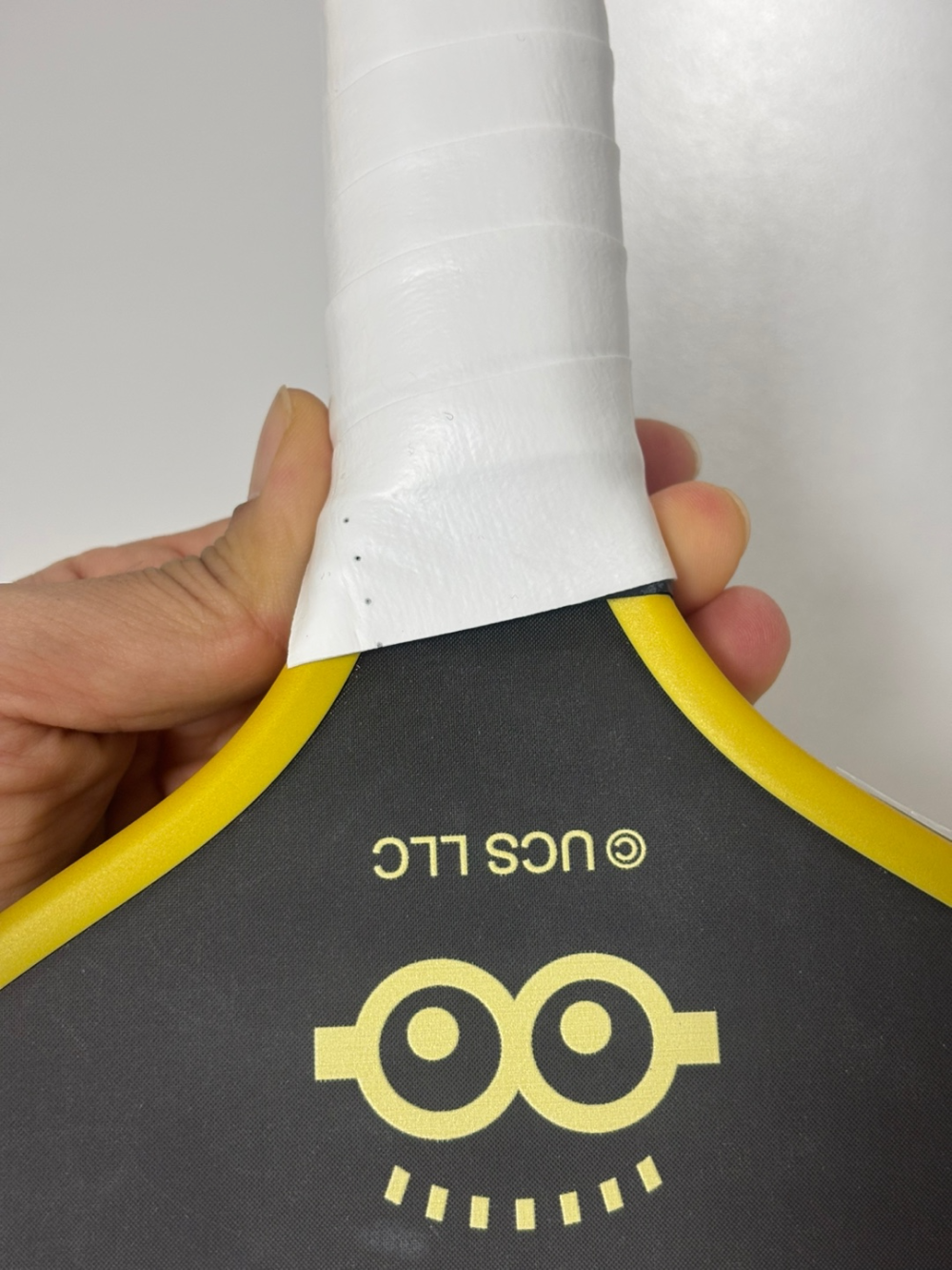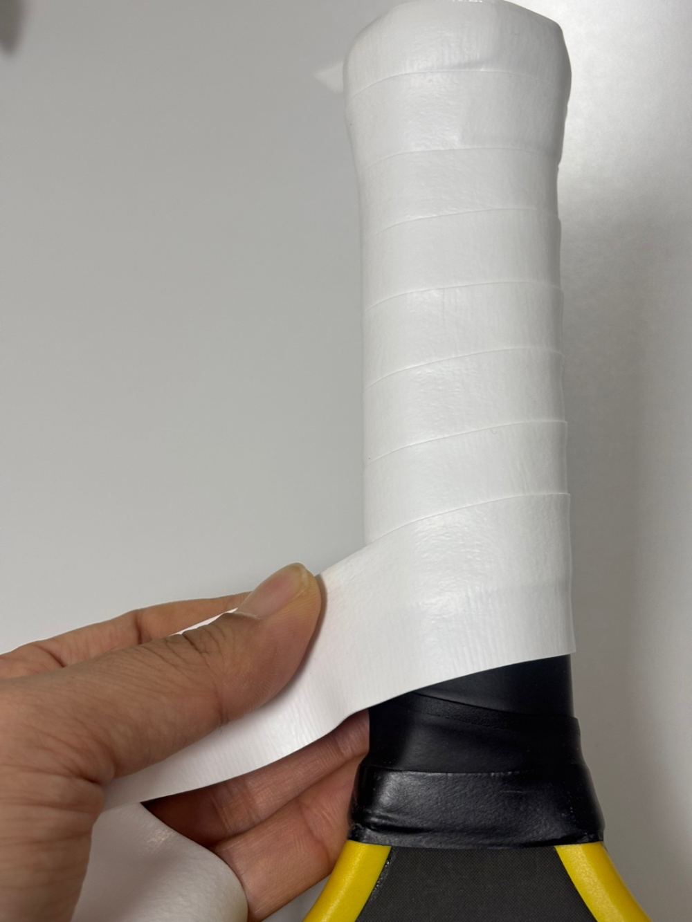 패들 손잡이의 가장 넓적한 면 아래쪽부터 시작해요. 처음 한 바퀴는 겹치지 않게 감고, 그 이후부터는 앞서 감긴 그립의 50%를 덮도록 겹쳐 감아올라가면 됩니다.