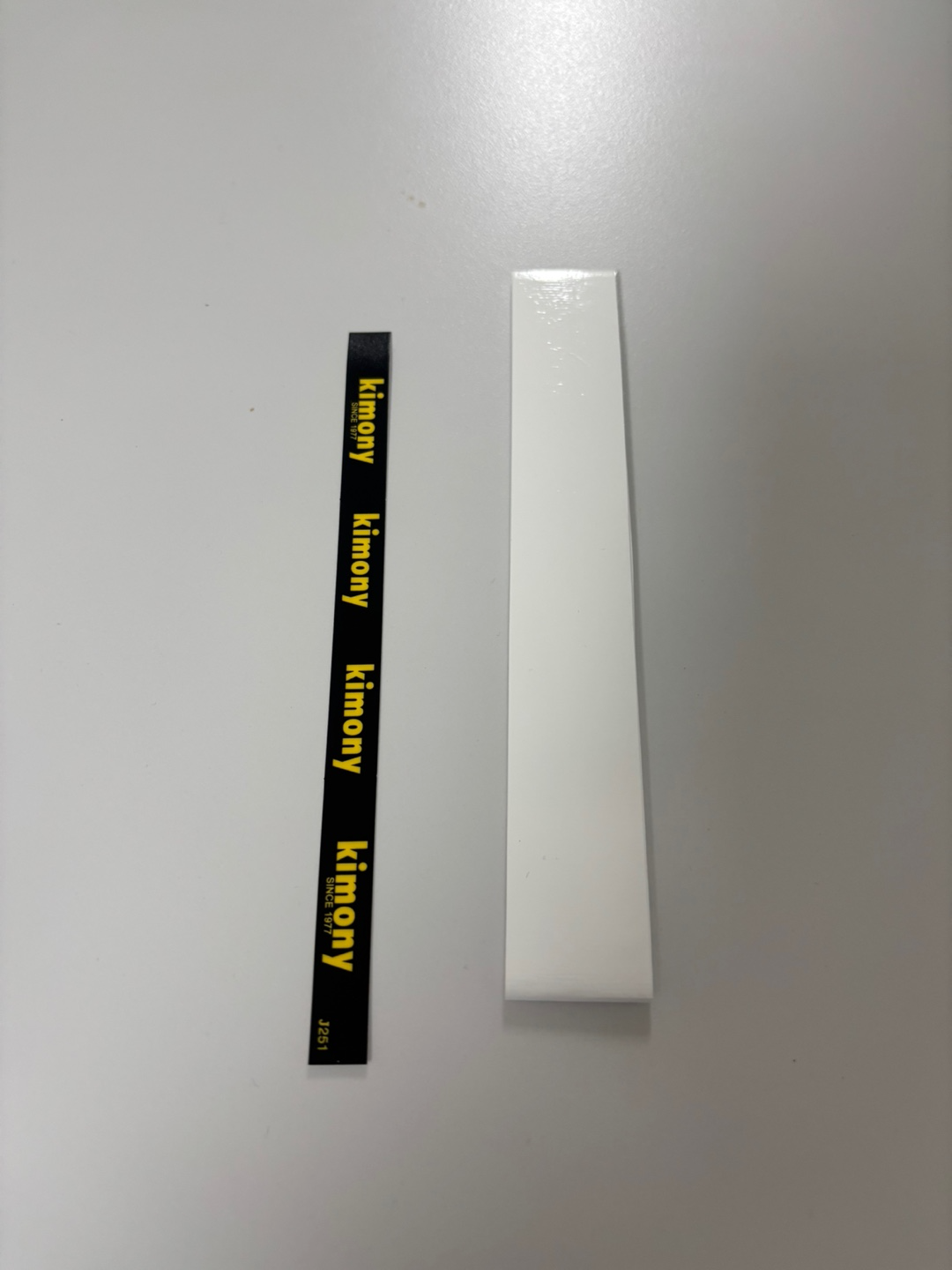 오버그립을 펼치고 얇은 비닐을 제거해요. 그립 끝에 접착 스티커가 붙어 있는데, 접착력이 너무 강하면 원그립이 손상될 수 있어서 손가락으로 몇 번 붙였다 뗐다 해서 접착력을 살짝 줄여주는 게 좋아요.